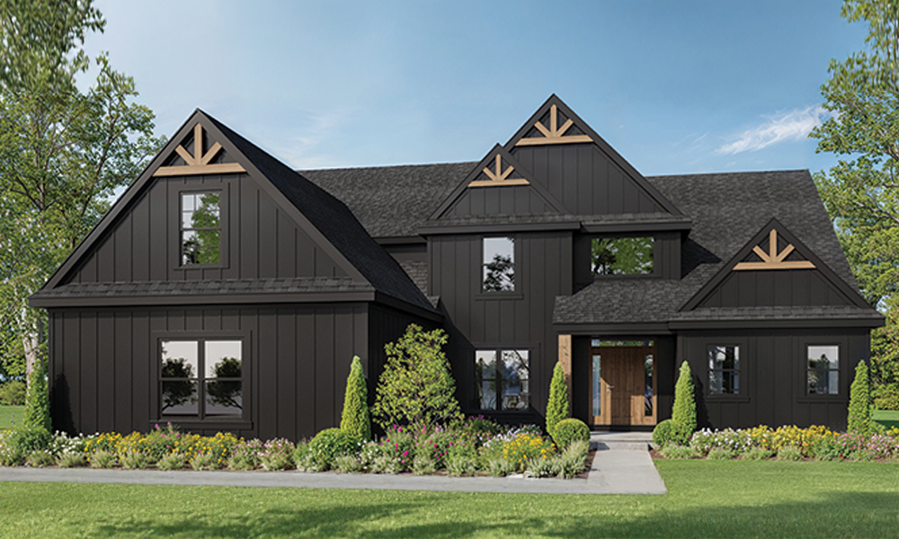 This Parade of Homes new build showcases a grand foyer with natural wood pan ceiling and black-and-gold European inspired glass fixtures, natural wood LVP flooring, and a two-story black tile fireplace with wood mantel. The gourmet kitchen features Bosch appliances and quartz countertops. The primary suite includes a double pan ceiling with rope lighting, a unique ceiling fan, and a luxurious bath with black tile and gold penny tile accents. Enjoy LED defrost mirrors, a custom master closet with black dresser, and an epoxy-finished garage.